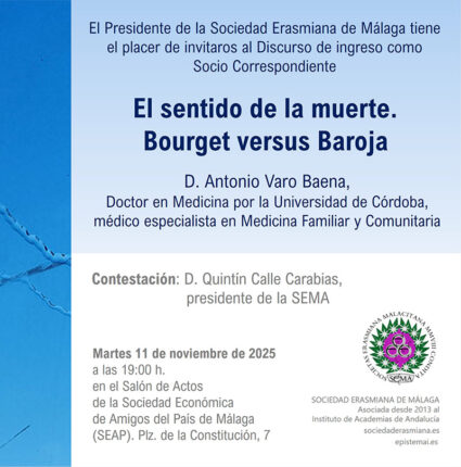Discurso de ingreso en la SEMA como Socio Correspondiente en Córdoba de D. Antonio Varo Baena, doctor en medicina; especialista en Medicina Familiar y Comunitaria y en Medicina Preventiva y Salud Pública; experto universitario en Bioderecho y en Virus Emergentes y Máster en Bioética y en Economía de la Salud, que versará sobre ‘El sentido de la muerte. Bourget versus Baroja’.
