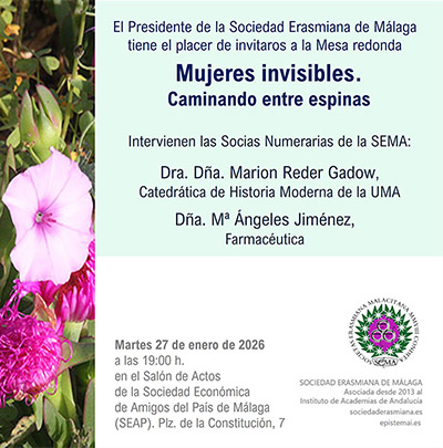 27/01/2026. Mesa redonda: ‘Mujeres invisibles. Caminando entre espinas’. Intervendrán Doña Marion Reder Gadow –catedrática emérita de Historia Moderna de la UMA y socia numeraria de la SEMA– y doña María Ángeles Jiménez –farmacéutica y vicepresidente segunda de la SEMA.