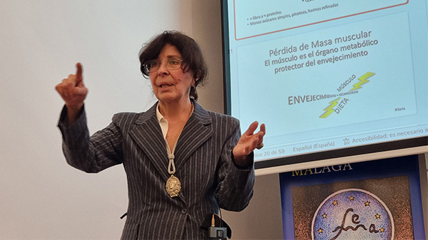 Hizo especial hincapié Paloma Soria en la pérdida de masa muscular, la función de protección del músculo en el envejecimiento y el extenso papel de las mioquinas. En la estrategia de protección frente a la pérdida de músculo de nuevo aparece la alimentación, que, junto a su complemento, el ejercicio, son los elementos clave. La sarcopenia es el gran enemigo en edades avanzadas, pero se puede prevenir y mitigar con ejercicio y una nutrición adecuada. En este apartado, describió las cuatro cosas que ayudan al mantenimiento joven del cuerpo durante más tiempo: alimentación ajustada a necesidades, evitar la pérdida de masa muscular, mantener un aprendizaje activo y una actitud positiva de relación con el entorno.
