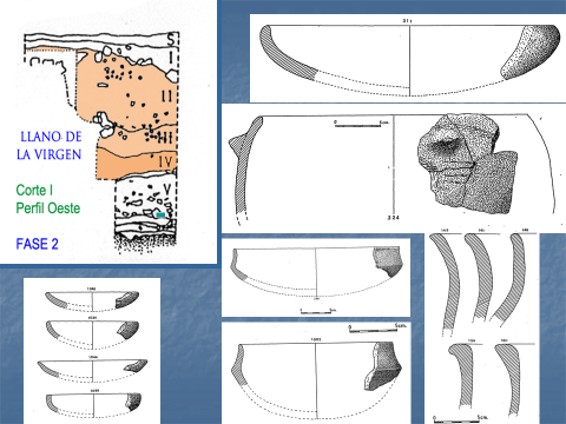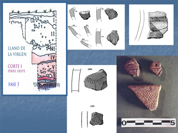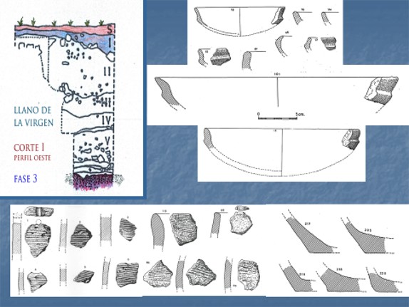 En primer lugar, aparecen dos estratos, el Superficial y el I, cuyos materiales más representativos son las cerámicas esgrafiadas y los cuencos de carenas altas. A continuación, se documentaron tres estratos que parecen constituir el floruit de la ocupación, pertenecientes a una fase 2, con vasos cerámicos de carenas medias y orzas de almacenamiento como materiales más significativos (fig. 6). Tras este paquete estratigráfico tenemos los niveles iniciales de la ocupación del Llano, que a juzgar por la presencia de cerámicas con decoración campaniforme se situarían en una fase de la Edad del Cobre tardío. A modo de sospecha bien fundamentada, en la base de la estratigrafía hay materiales como las fuentes de borde engrosado y las de borde exvasado (junto con los cuernecillos de arcilla) que nos hacen abrigar la sospecha de la existencia de una etapa más antigua que la anterior, ya de la Edad del Cobre Pleno (fig. 7 y 8). Y esa sería la etapa de fundación del poblamiento.