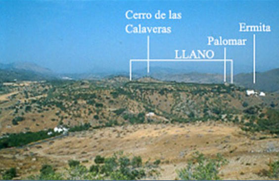 Tomando como referencia la vista del yacimiento desde unas lomas algo más altas, situadas al este (fig. 2), se distinguen de derecha a izquierda: la Ermita de la Fuensanta, el Palomar, ruinas de una construcción moderna que debió ser una casa de labor, el Cerro de las Calaveras (detrás en la imagen del Llano, el topónimo resultó justificado por la ubicación en él de una necrópolis medieval) y el Llano propiamente dicho, que es la superficie plana de la imagen perfectamente perfilada por laderas delimitadoras.