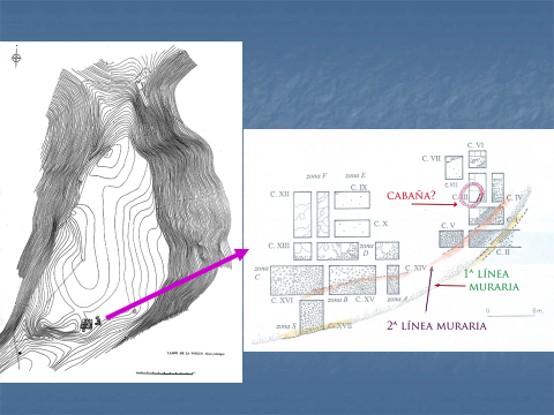En la figura 4 puede verse, a la izquierda, la planimetría que realizó Castejón Gordo y a la derecha el detalle de las estructuras horizontales excavadas, los cortes, dieciocho en total. O sea, una extensión grande, aunque muy irregular en cantidad y calidad de datos, ya que los más cercanos al borde de la llanada tenían una importante potencia estratigráfica (en torno a los 2 metros) frente a las zonas más al interior, que apenas habían acumulado depósitos de unos pocos centímetros.