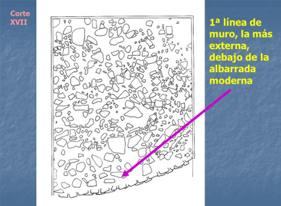 En el corte XVII (fig. 11), lo primero que llama la atención es que, superficialmente, bajo la albarrada moderna que contornea parcialmente esta parte del Llano, nos encontramos con un derribo de sillarejos revueltos con argamasas, detectado desde el principio en el Corte I, que parecían indicar la destrucción de una estructura de cierre de esta parte del yacimiento, la más vulnerable defensivamente, ya que se podía seguir en casi todos los cortes de la zona periférica, Cortes I, II, V, XIV, XV, XVI y XVII. Al parecer se veía amortizado y, delante de su derribo, en este Corte XVII, se documentaron también dos líneas de sillarejos paralelas, con relleno interior, que, suponemos, vendrían a constituirse en una línea de defensa que sustituiría a la anterior y que, naturalmente sería posterior a ella.