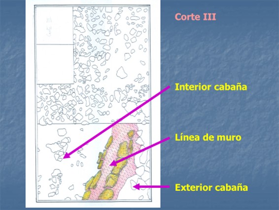Además de estas posibles líneas de defensa, en el Corte III (fig. 14), apareció otra estructura que no tiene que ver por su situación con el carácter de cierre y de defensa como la anterior, sino que pudo tener una función de estructura de hábitat.