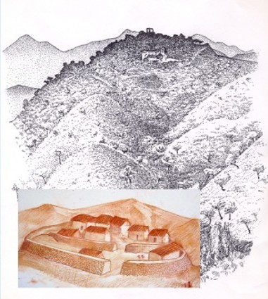 Fig. 15. Dibujo idealizado del cerro del Llano desde el norte y dibujo en sepia de un poblado imaginado de finales de la Edad del Bronce