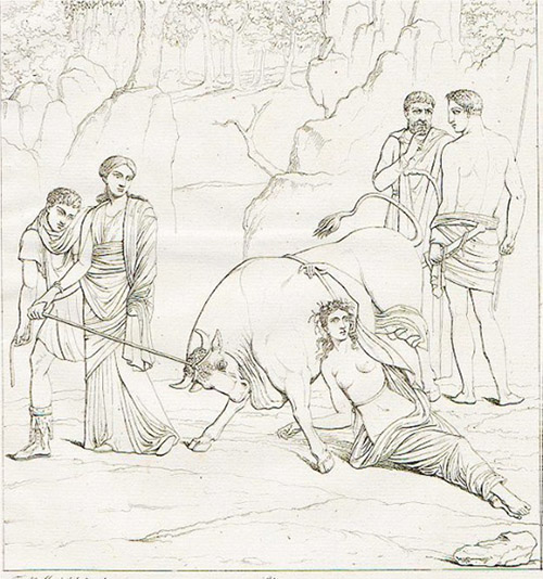 En el siglo XIX vuelven a aparecer imágenes del mito de Dirce gracias al descubrimiento de pinturas murales en Herculano y Pompeya. Entre los ejemplos de pinturas pompeyanas, son conocidas una de la casa de los Vetii (Figura 8) y otra de la casa del Granduca conservada en el Museo Arqueológico de Nápoles (Figura 9). Se difundieron a lo largo del s. XIX por medio de dibujos y prolijas descripciones en publicaciones científicas como las Memorie della Regale Accademia Ercolanese di Archeologia. Pero este resurgimiento y difusión de las imágenes tuvieron lugar sobre todo entre historiadores del arte y arqueólogos (Figuras 10 y 11).