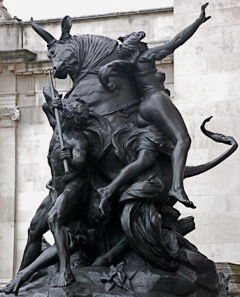 Una representación inesperada y tardía es un gran grupo escultórico en bronce que imita al Toro Farnesio en su forma piramidal y en la representación de Anfión y Zeto azuzando al toro al que está atada Dirce (Figura 12); lo realizó Charles Lawes-Wittewronge en 1906. Se encuentra junto a la puerta de entrada en la Tate Gallery de Londres. Esta escultura, junto a la versión en mármol que el mismo escultor realizó ocho años después, es la última que conozco que representa el mito griego pagano de Dirce, y es de suponer que su realización se debió no solo a los hallazgos de Pompeya y Herculano sino, sobre todo, al éxito que tuvo en la misma época la derivación cristiana del mito.