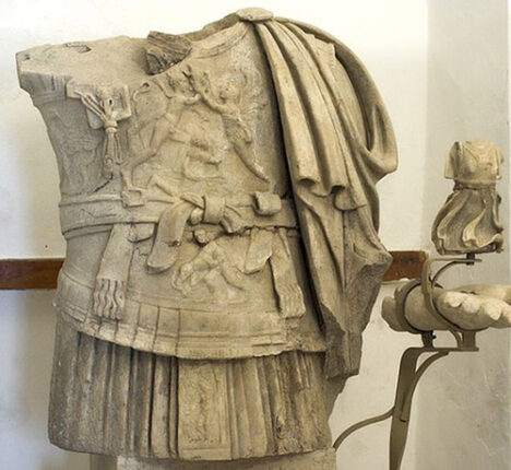 En el arte romano encontramos también una representación del suplicio de Dirce que, aunque sigue el esquema iconográfico del grupo escultórico de Apolonio y Taurisco de Tralles, es especialmente llamativa por su entorno y su posible significado (Figura 7): se trata de una escultura en mármol de un torso romano con coraza, del s. I a.e., hallada en el templo de Dioniso en Iria (Naxos) y conservada en el Museo Arqueológico de la misma isla. Forma parte de lo que, según los arqueólogos que excavaron el templo, podría ser un retrato de Marco Antonio. La cabeza se ha perdido; ¿por casualidad o quizás a causa de la damnatio memoriae? Está decorado con tres relieves: dos representan a los dos personajes míticos con los que Antonio pretendía identificarse: en el centro está Heracles luchando con el león de Nemea, y por debajo de la coraza, en el pliegue central de la túnica, se puede ver a Dioniso con el tirso acompañado por una pantera. En la mano izquierda lleva una ménade (otro elemento dionisíaco) en lugar de una Nike. En la parte superior de la coraza, se ve a Anfión y Zeto atando a Dirce a los cuernos del toro, con una iconografía igual a la del Toro Farnesio. ¿Qué explicación puede tener y qué relación puede guardar con los otros relieves? Para los arqueólogos que excavaron el santuario, simbolizaría el poder de Marco Antonio en el Este, como un Nuevo Dioniso, dado que el grupo escultórico de Apolonio y Taurisco había sido llevado de Rodas a Roma y Antonio había restaurado el poder de Rodas después de la batalla de Filipos. Con la representación del suplicio de Dirce, Antonio desearía representar “su irresistible fuerza dionisíaca”, pues el toro era también imagen de Dioniso. De ser cierta la relación de la escultura con Antonio, de nuevo nos encontraríamos ante una representación del suplicio de Dirce vinculada con la política.