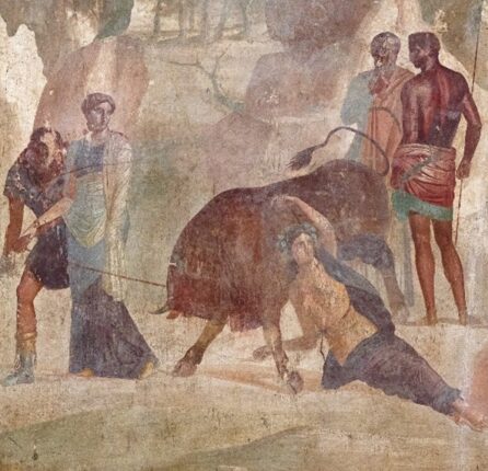 El mayor éxito del episodio del suplicio de Dirce se produce en el arte romano; las numerosas representaciones pueden fecharse entre el s. I a.e. y el IV e.c.: en objetos pequeños como gemas, medallones, estatuillas, lámparas de terracota y, sobre todo, en pinturas murales, la mayoría procedentes de Pompeya y Herculano, y en mosaicos de diferentes lugares del imperio. Entre los mosaicos, (Figura 6) podemos citar uno de Pula, en Croacia, del s. III e.c. y otro de Écija, del s. III e.c.