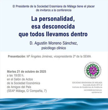 Conferencia que impartirá D. Agustín Moreno Sánchez, psicólogo clínico. Presentación: Dña. Mª Ángeles Jiménez González, vicepresidente 2ª de la SEMA. Martes 21 de octubre de 2025, a las 19:00h, en el salón de Actos de la Sociedad Económica de Amigos del País (SEAP_Málaga, C/ Compañía, 7). Entrada libre hasta completar… Continue reading